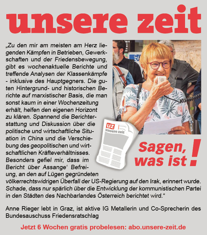 Die DKP ist eine Partei des Friedenskampfes, sie bekämpft die Kriegstreiberei, die heute vor allem vom US-Imperialismus, der NATO und den führenden imperialistischen Ländern in der EU und Europa ausgeht.